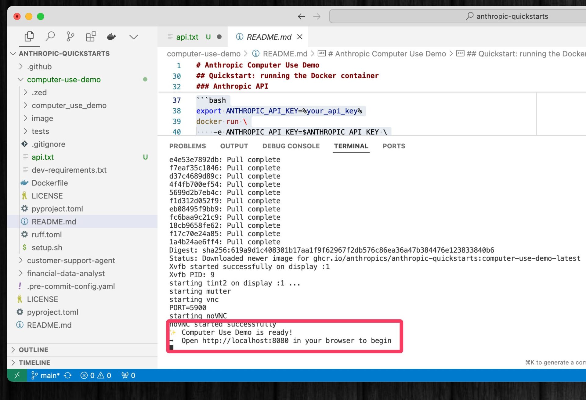 export ANTHROPIC_API_KEY=***ここに自分のAPIキーをペースト***docker run \ -e ANTHROPIC_API_KEY=$ANTHROPIC_API_KEY \ -v $HOME/.anthropic:/home/computeruse/.anthropic \ -p 5900:5900 \ -p 8501:8501 \ -p 6080:6080 \ -p 8080:8080 \ -it ghcr.io/anthropics/anthropic-quickstarts:computer-use-demo-latestこのコマンドを丸ごとコピーして、ターミナルに打ち込む。