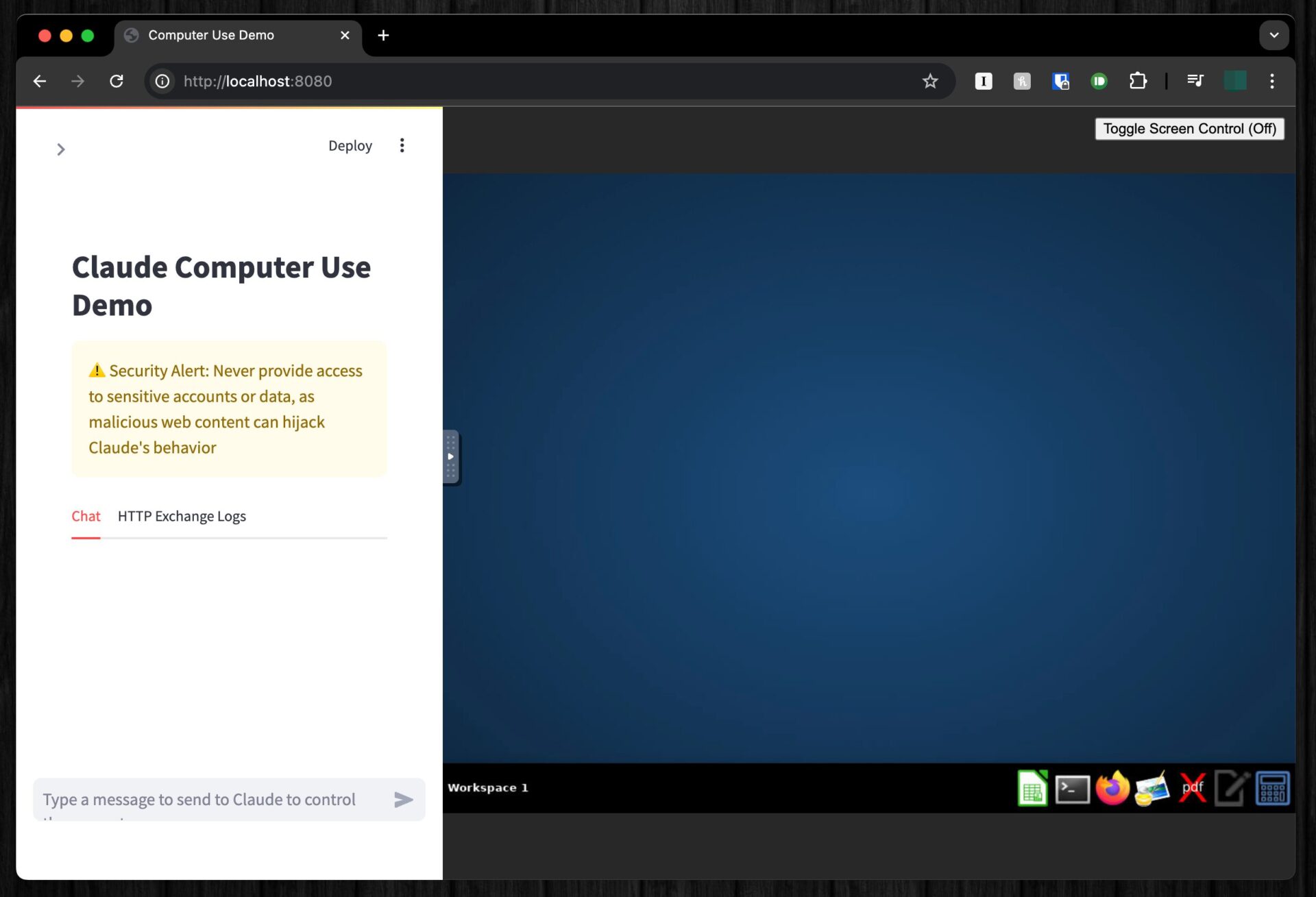 ✨ Computer Use Demo is ready!➡️ Open http://localhost:8080 in your browser to beginhttp://localhost:8080をGoogle ChromeやSafariなどのブラウザで開くと、Computer use APIを利用できる画面が表示されるはずだ。