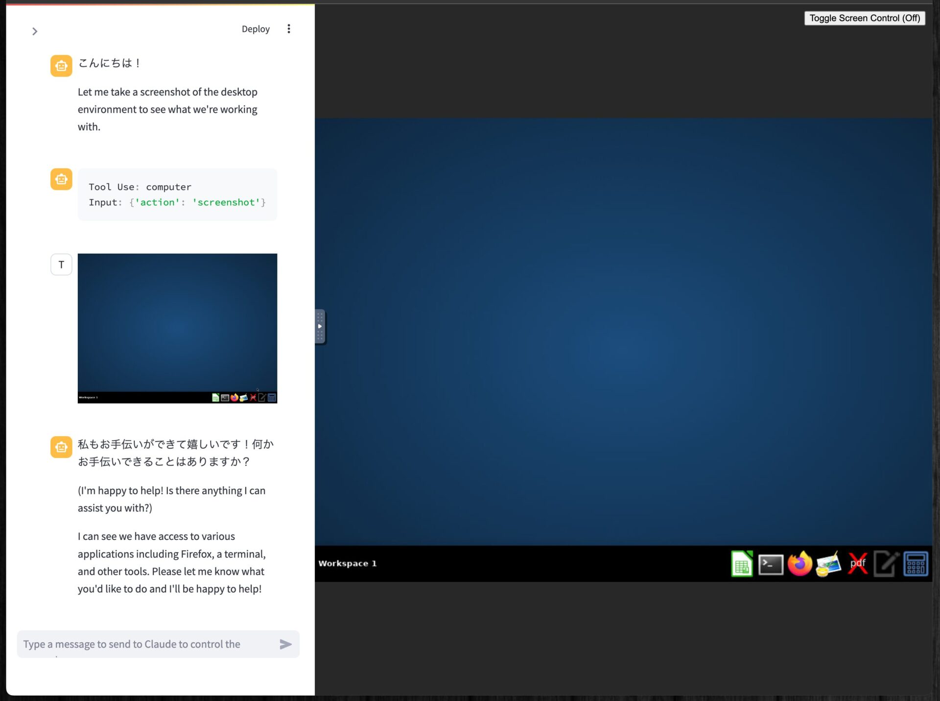 Tool Use: computerInput: {'action': 'screenshot'}という部分で、スクリーンショットツールを呼び出していることが分かる。