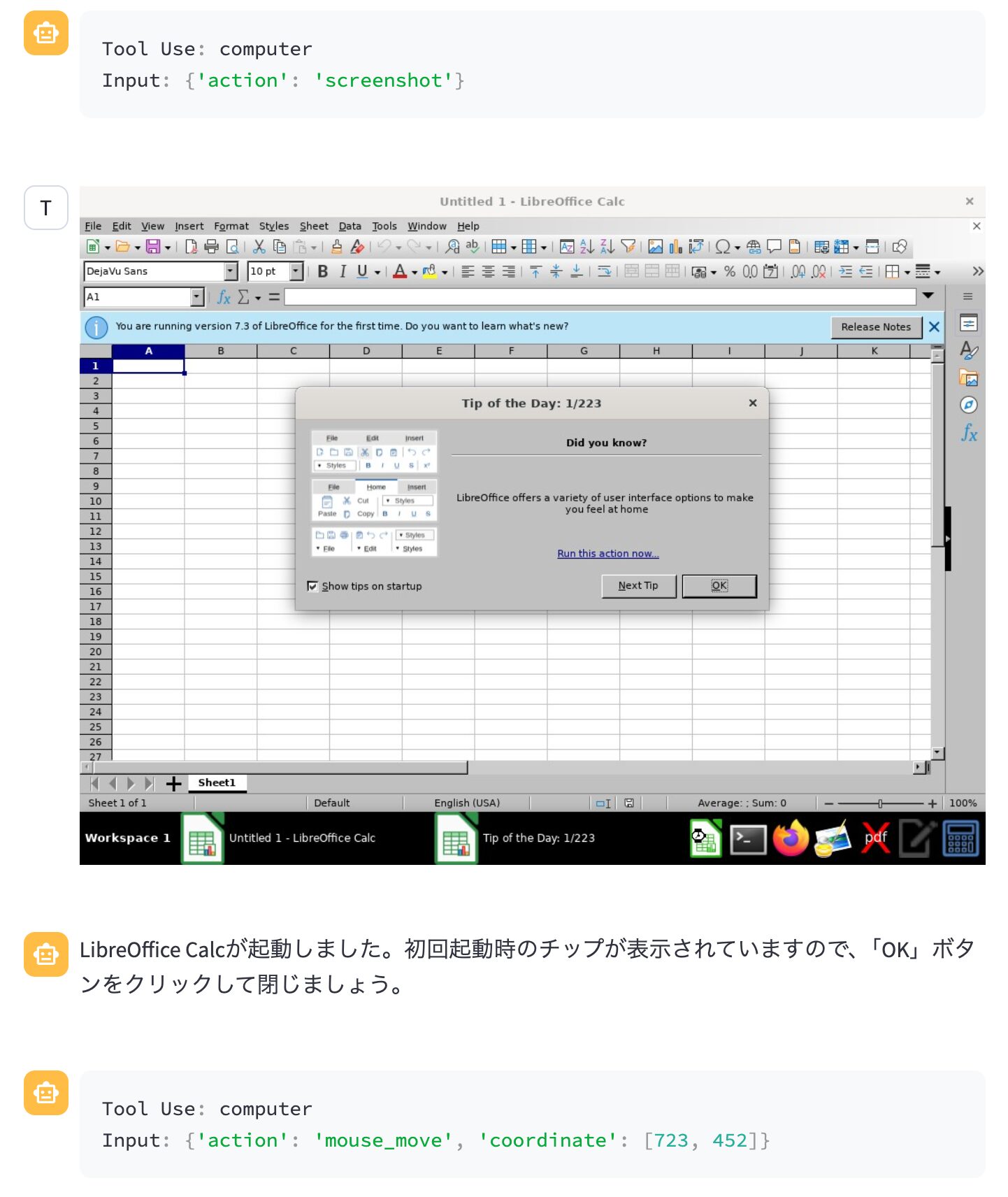 Tool Use: computerInput: {'action': 'screenshot'}しかも、表計算アプリ(LibreOffice Calc)は無事起動できていたものの、スクリーンショットを撮った結果、初回起動時の不要な画面が表示されていることにAIが気付き、これを閉じるための「OK」ボタンのクリックまで自主的に実行してくれた。