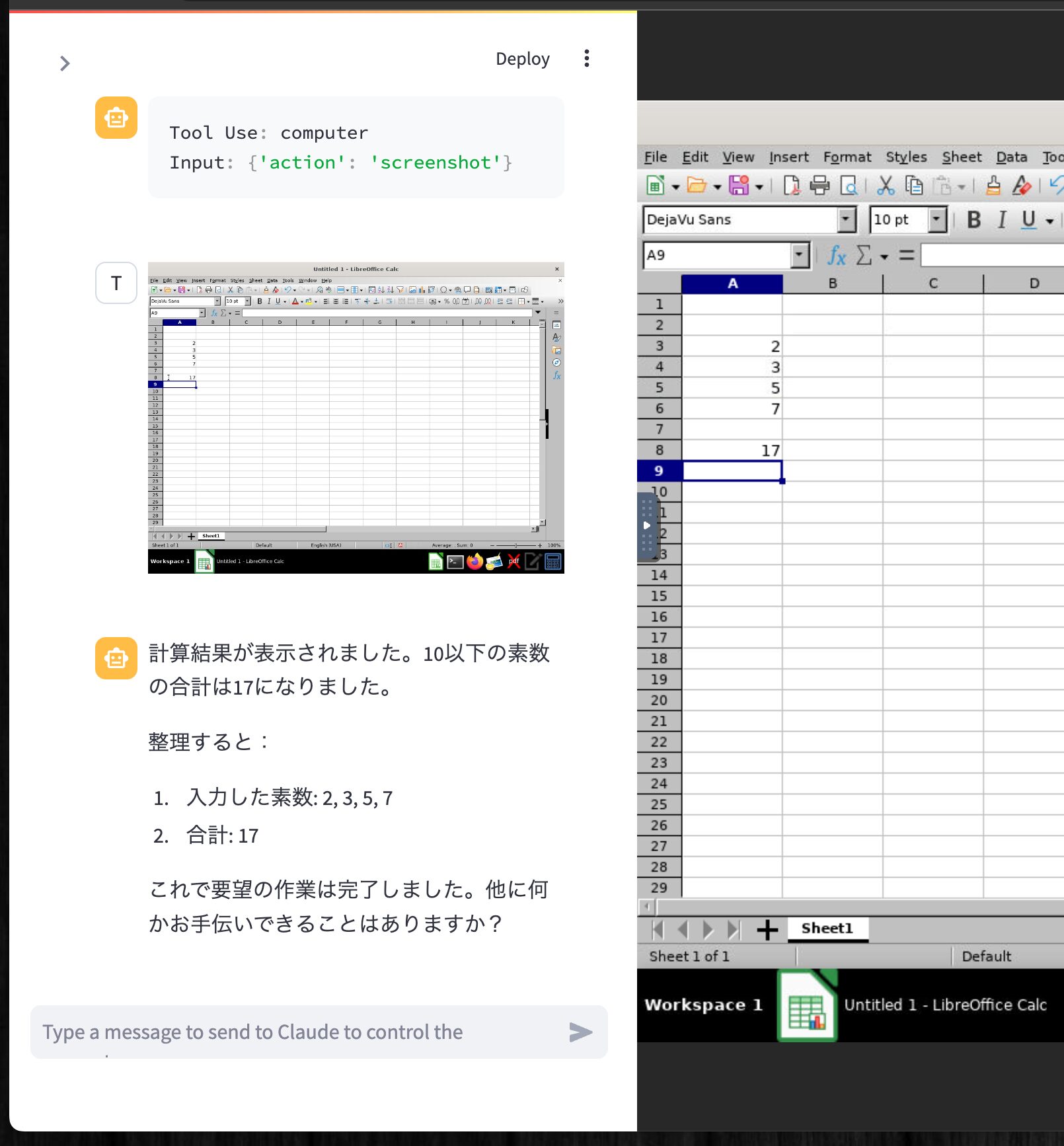 Tool Use: computerInput: {'action': 'left_click'}最後にスクリーンショットを撮って結果を確認している。