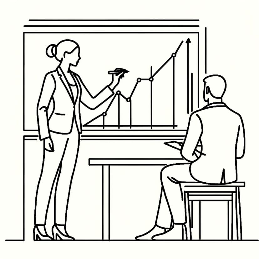 「ビジネスミーティングの様子を表現した、シンプルでミニマリスティックな線画を生成して下さい。ホワイトボードにグラフを書いている女性と、それを見ている男性を描いて下さい。背景は白色で、線の色は黒として下さい。画像のサイズは”1024x1024”とします。」