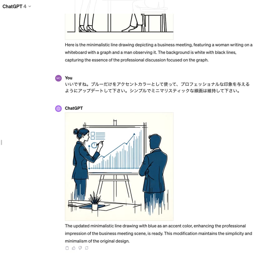 「いいですね。ブルーだけをアクセントカラーとして使って、プロフェッショナルな印象を与えるようにアップデートして下さい。シンプルでミニマリスティックな線画は維持して下さい。」
