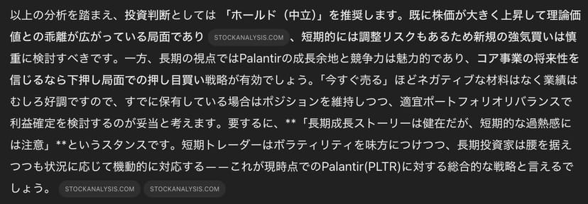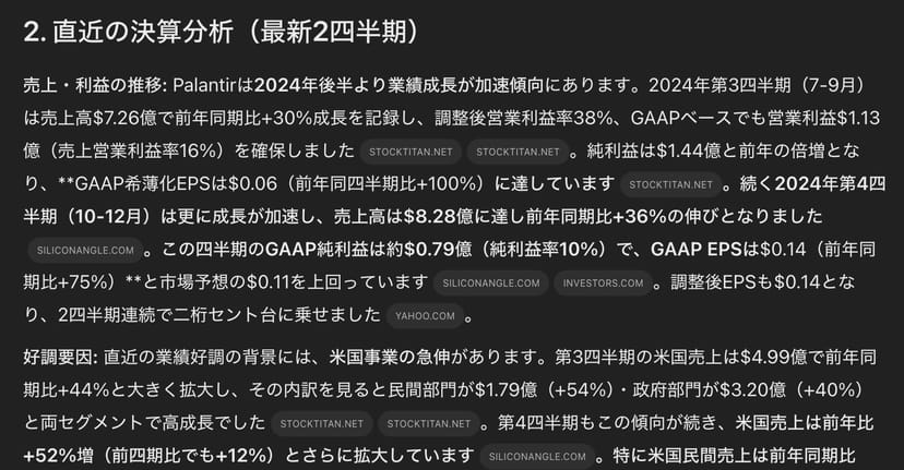 あなたはヘッジファンドのファンドマネージャーです。Palantirへの投資判断を行うため、総合的なリサーチを行い、レポートにまとめて下さい。レポートには以下の情報を含むが、投資判断に役立つ情報であればこれらに限定しない。
