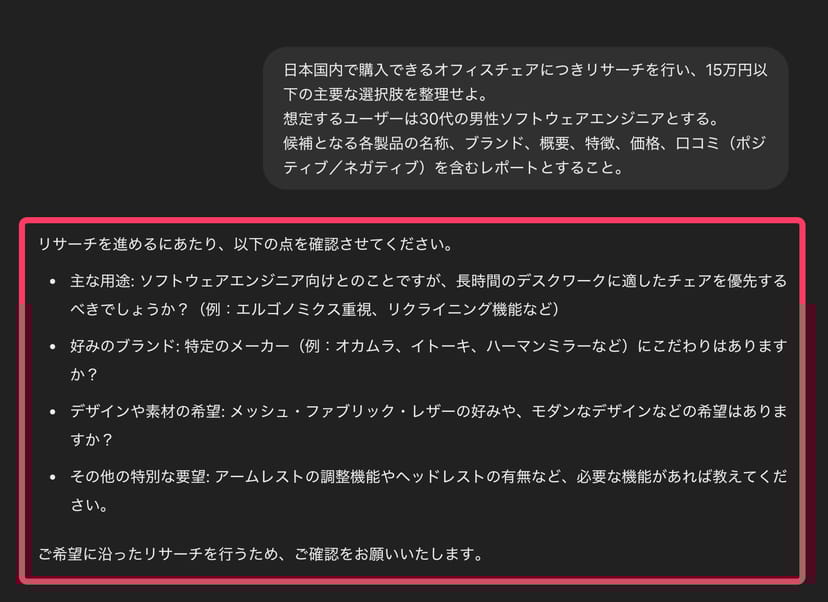 中でも、ChatGPTのDeep ResearchではAIが「フォローアップ質問」を行い、ユーザーの意向を明確にするのが特徴だ。
