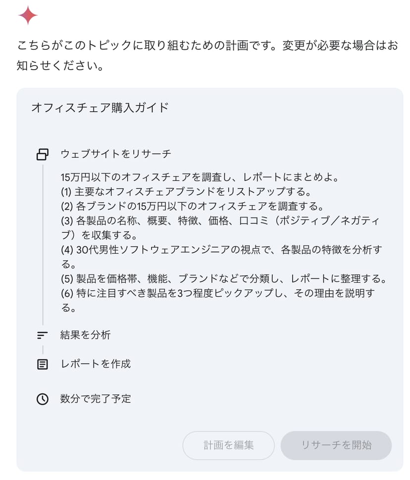一方。GeminiのDeep Researchは、「リサーチ計画」を事前にユーザーに見せて、必要があればユーザーが軌道修正できるようにしている。