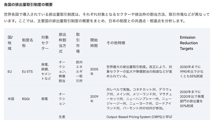 日本で導入される予定の「排出量取引制度」について理解するため、日本を含む先進諸国における制度概要を、表と文章を用いてレポートにまとめてください。特に、排出権取引制度に関連して新たなビジネスチャンス・収益機会を探索するため、すでに排出権取引制度が導入されている国や地域における関連企業・団体の事例にも触れてください。実際に生成されたレポートは、それぞれ以下の通りだ。ChatGPTの方が記述が充実してはいるが、投資レポートの例ほど、圧倒的な実力差はないようにも感じられる。