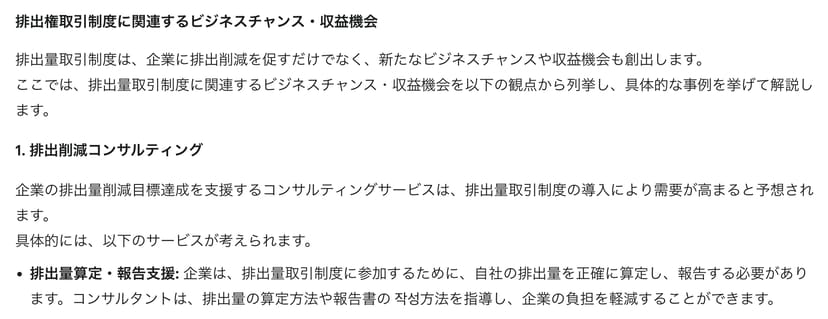 ただし、プロンプト後半で指示した「排出権取引制度に関連して新たなビジネスチャンス・収益機会を探索」という点への回答は、ChatGPTの方がより網羅的に検討し、かつ事例も多数集めてきてくれている(以下画像)。