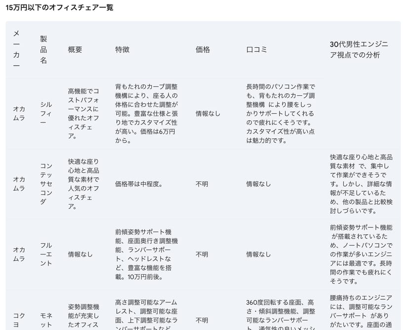 オフィスチェアの購入のため、予算に応じた候補を挙げてもらい、それぞれのチェアについての口コミを収集してもらう。