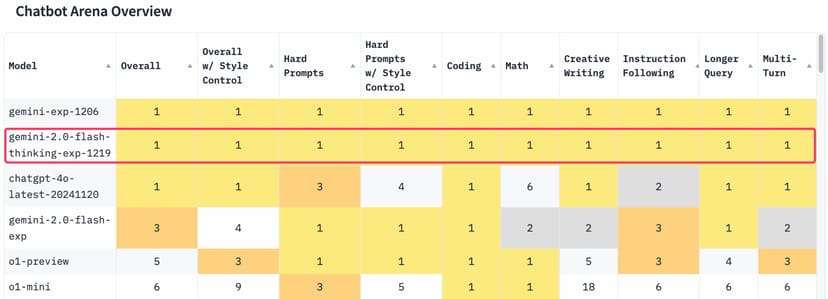 その性能は極めて高く、「Gemini 2.0 Flash Thinking」は、記事執筆現在、ユーザー投票による大規模言語モデルの性能ランキングサイト Chatbot Arena の全ジャンルで1位に君臨している。