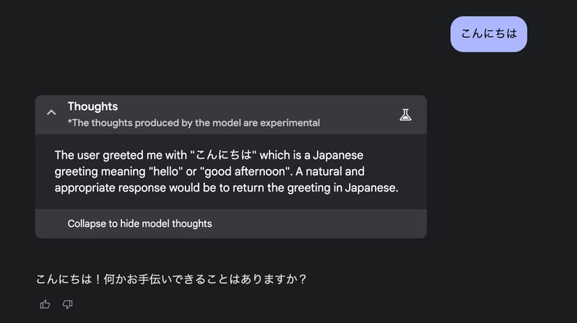 例えば、単に「こんにちは」と打ち込んでみただけだが、Geminiがユーザーからの「こんにちは」を受け取った後、それが日本語の挨拶であり、日本語の挨拶を返すのが適切である、という思考を行った流れを覗き見ることができる。