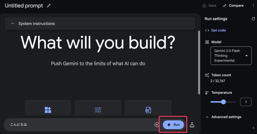 下部にGeminiに回答してほしい質問などを打ち込み、「Run」をクリックするだけで、AIによる回答が生成される。