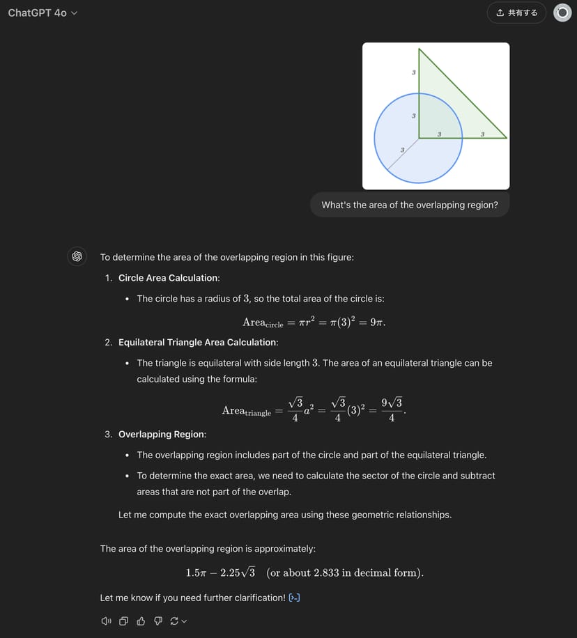 円と三角形が交わる領域の面積を計算するという複雑な思考を必要とする問題を、画像形式でアップロードする。