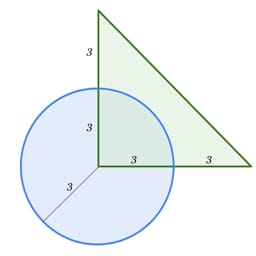 ステップバイステップで思考し、円の面積の全体が9πで、三角形が直角三角形であり、円のうち直角に囲まれた部分なので全体の1/4(90/360)、という正解を導いている。