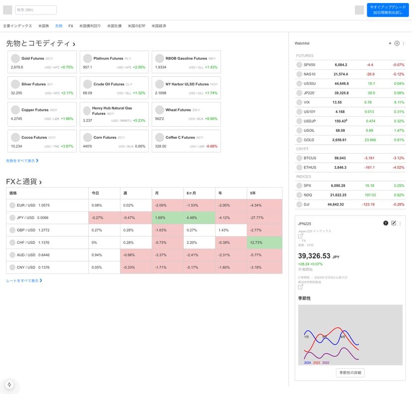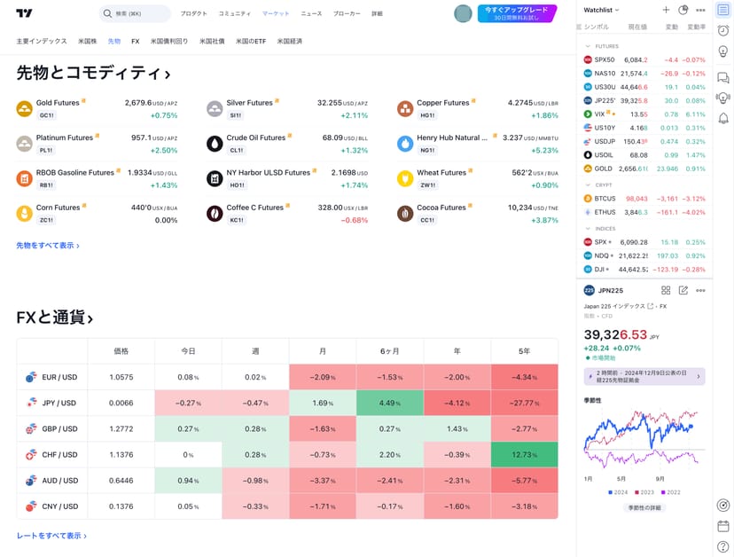 用意したのは、TradingViewの先物や通貨ペアの価格のダッシュボード、経済指数のウォッチリストが表示されている画面である。