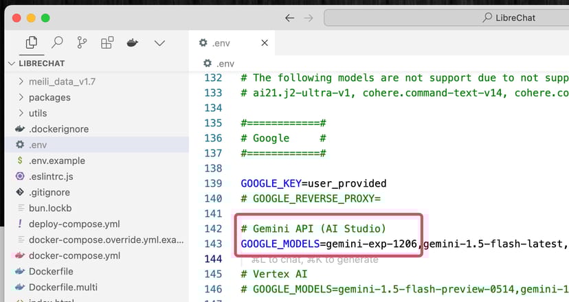今回はGoogleのモデルを追加したいので、143行目にある「GOOGLE_MODELS」の中に、gemini-exp-1206を加筆する必要がある。