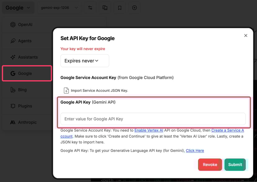 LibreChatのインストールを終えてから、以下の手順でGoogle GeminiのAPIキーを追加することで、gemini-exp-1206も利用できるようになる。