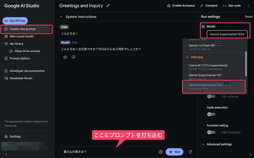左側のメニューで「Create new prompt」を選択すると新しいチャットスレッドが作れ、画面右上で使用するGeminiのモデルを選択できる。