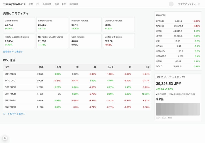 テーブルのヒートマップや、ダッシュボードの先物パネルの情報量など、gemini-exp-1206の方が再現度も、デザイン性も優れているように感じられる。