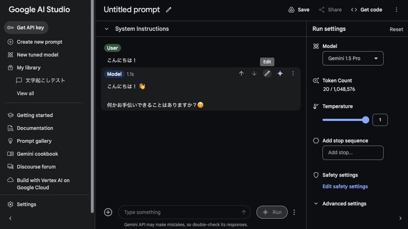 Google AI Studioの画面上では、中央でChatGPTやGemini Advancedのようなチャット形式のUIで、質問・プロンプトを打ち込み、「Run」をクリックすると、その質問に対するAIの回答が表示されるようになっている。