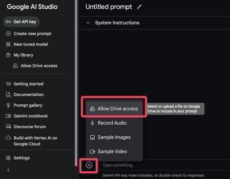 Google AI Studioのプロンプト入力欄の左側にある「+」ボタンをクリックすると、「Allow Drive Access」というGoogleドライブとの接続メニューがあるので、これをクリックする。