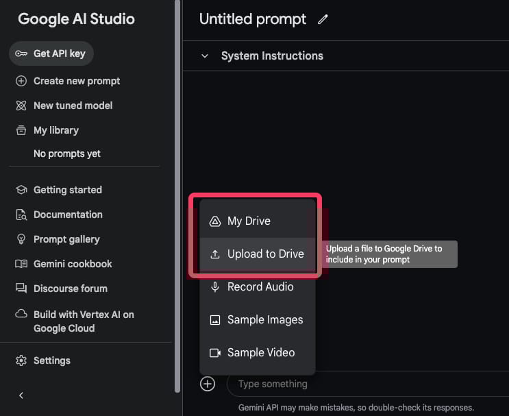Geminiに音声ファイルを読み込ませるには、Google AI Studio上で直接録音するか、Googleドライブにアップロードしたファイルを読み込ませるかの二択だ。
