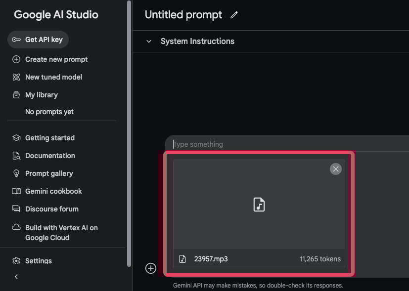 Google AI Studioを使えるようになったら、いよいよ音声ファイルをGemini 1.5 Pro / Flashに読み込ませ、文字起こしを行わせる方法を解説していく。