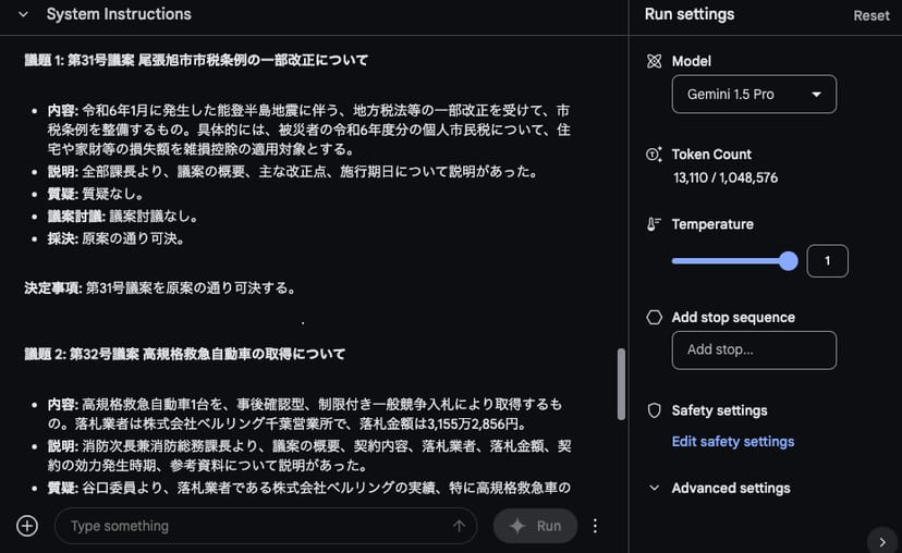 Google AI StudioでGemini 1.5 Proに文字起こしをさせたら、そのまま議事録として要約するようプロンプトで指示すれば、議事録の作成まで完結させることができてしまう。
