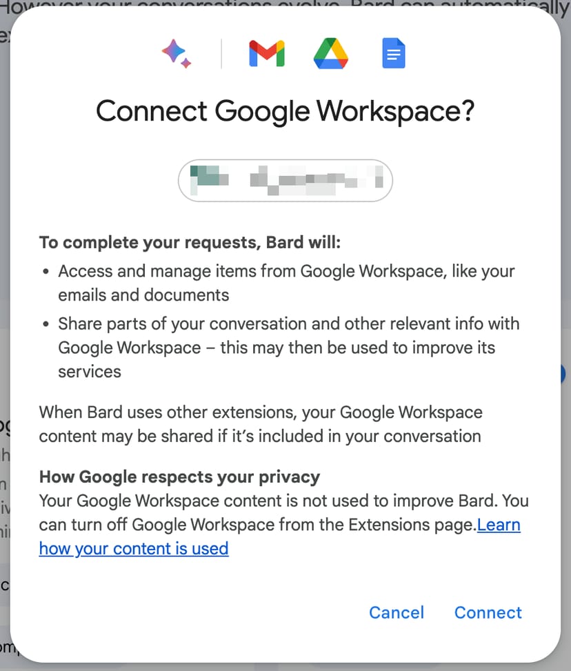 「Connect」を選択することで、Gmailのメールボックス、Googleドライブに保存しているファイル、Google Documentsのファイルに生成AIであるBardがアクセスして、それらのメールやファイルに基づいた回答をしてくれるようになる。