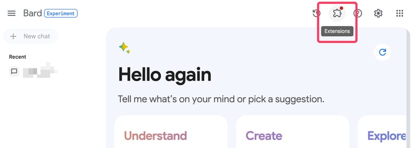 上記の方法でGoogle Bardを英語化できたら、Bardを開いた時に右上にパズルのピースのような「Extensions」のマークが表示される。
