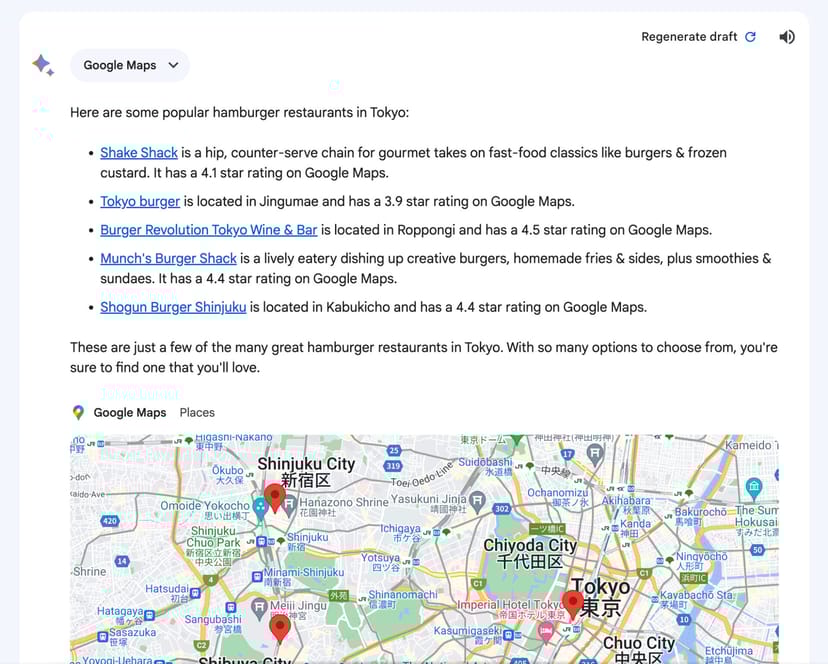例えば、「東京の人気のハンバーガーレストランを教えて」と指示すると、Google Maps上で評価の高いレストランを一覧で表示してくれる。