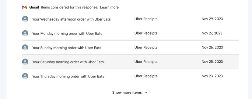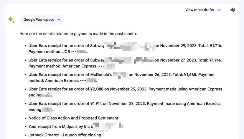 Find emails related to payments made in the past monthすると見事、私のメールボックスにあったUber Eatsの注文履歴のメールや、各種ウェブサービスへの支払い履歴を過去1ヶ月分だけ的確に抽出して表示してくれた。