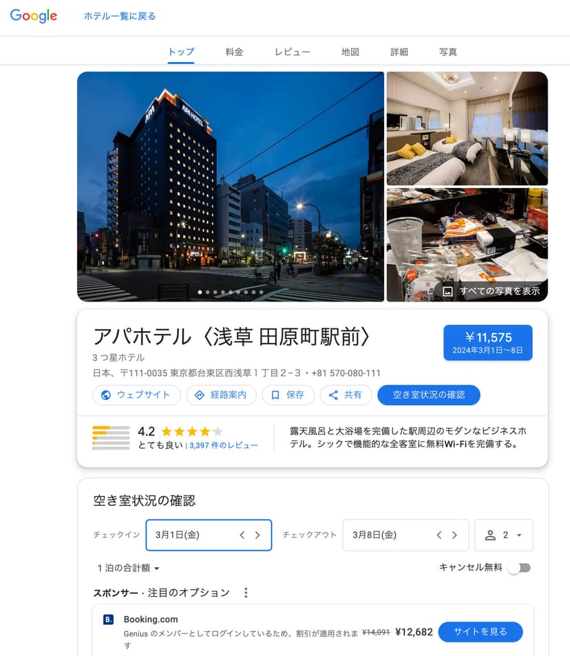 Find hotels in Asakusa area for a week in Marchアパホテルなどの候補が表示され、1泊1.1万円くらいだな、という概要が瞬時に掴める。