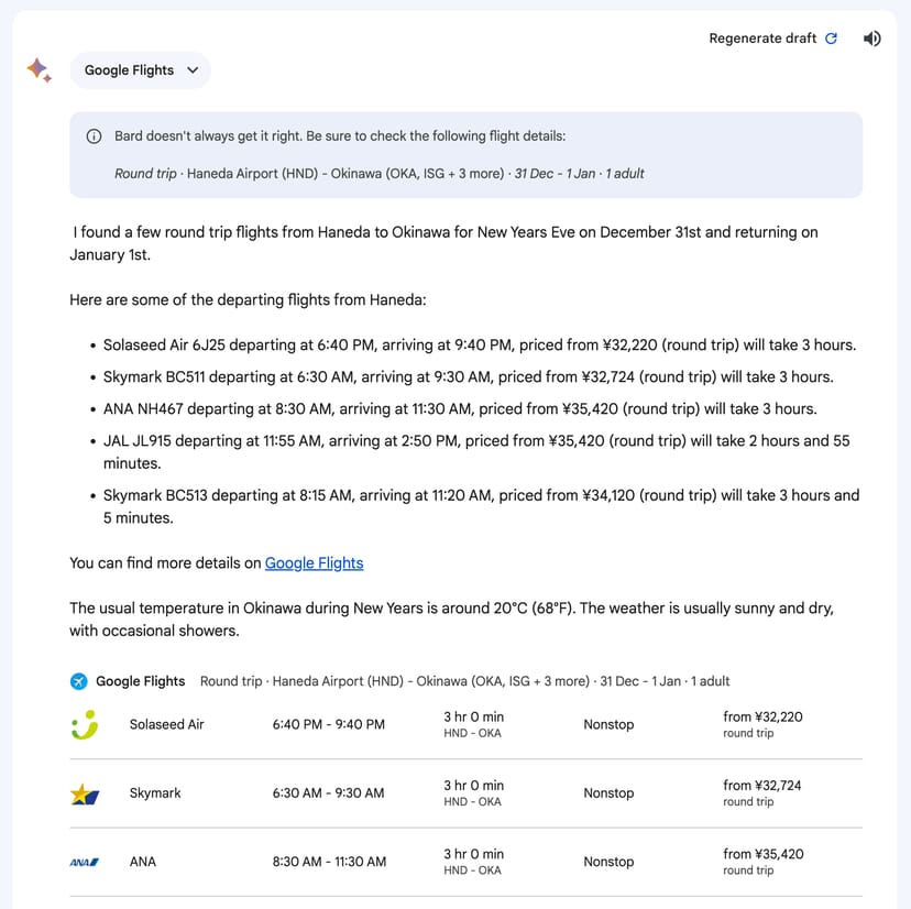 例えば羽田から沖縄に行くお正月の便を調べ、さらにその時期の沖縄の平均温度を聞いてみた。
