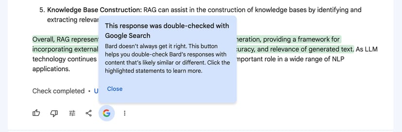 LLMが生成した情報が不確かな場合に、ユーザーに自分で更に追加でリサーチを行うことを促すことで、Bardの回答の信頼性を高めているのだ。