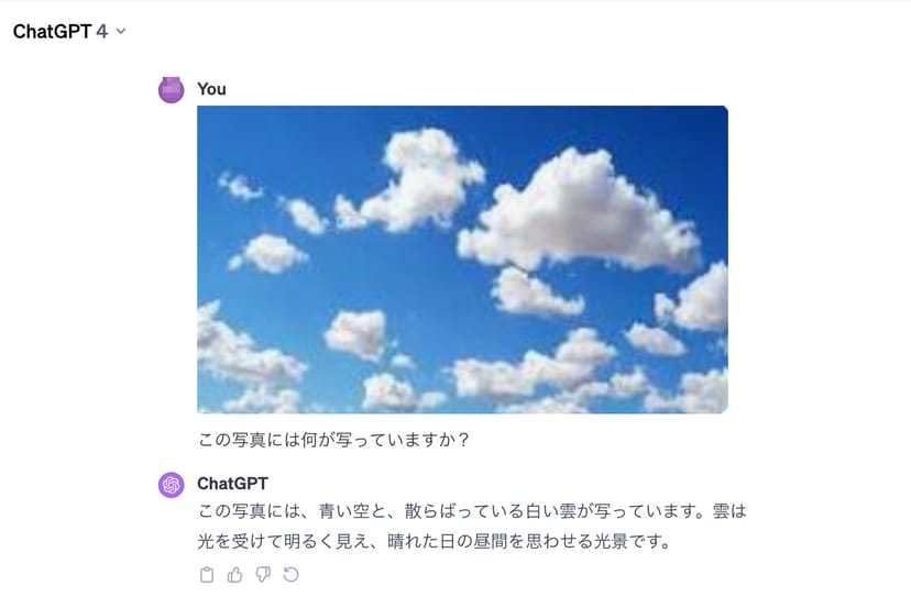 例えば、ChatGPTに青空の画像を読み込ませて、何が写っているかを聞いてみると以下の通り回答してくれる。
