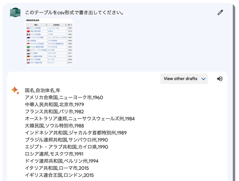 試しに、Wikipediaの東京都の項にある姉妹友好自治体のテーブルをスクショし、CSV形式にするように指示をしてみた。