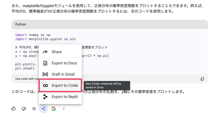 例えば、正規分布に従う乱数を生成させてヒストグラムを表示するPythonコードをGoogle Bardに質問して書いてもらった上で、回答の左下にある共有ボタンから、「Export to Colab」を選択すると、Google Colab上で実際にこのコードを実行してヒストグラムを描写することができる。