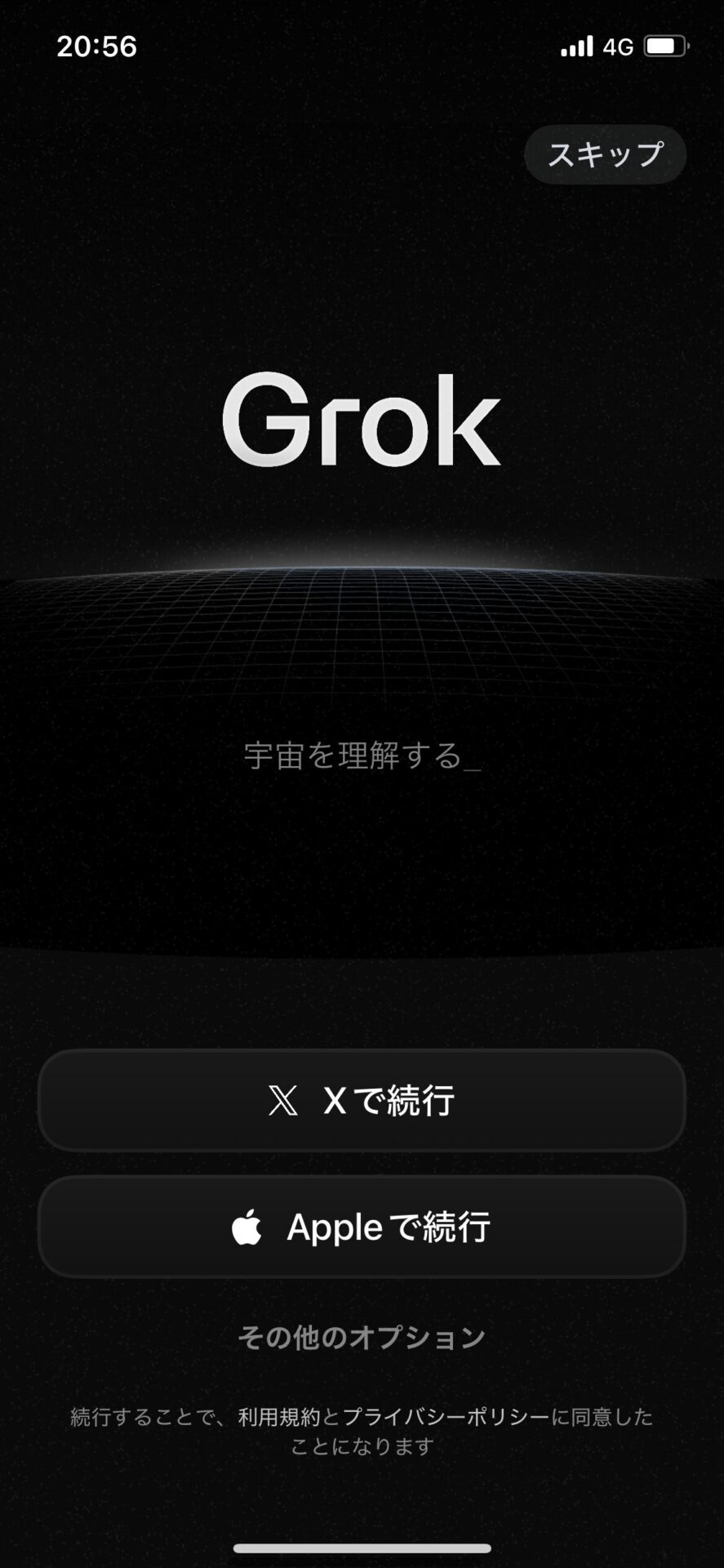 アプリを開くと、Web版と同じく、Xのアカウントでログインするか、Apple IDやメールアドレスを使って、新しくGrok用のアカウントを作るか選ぶことができる。