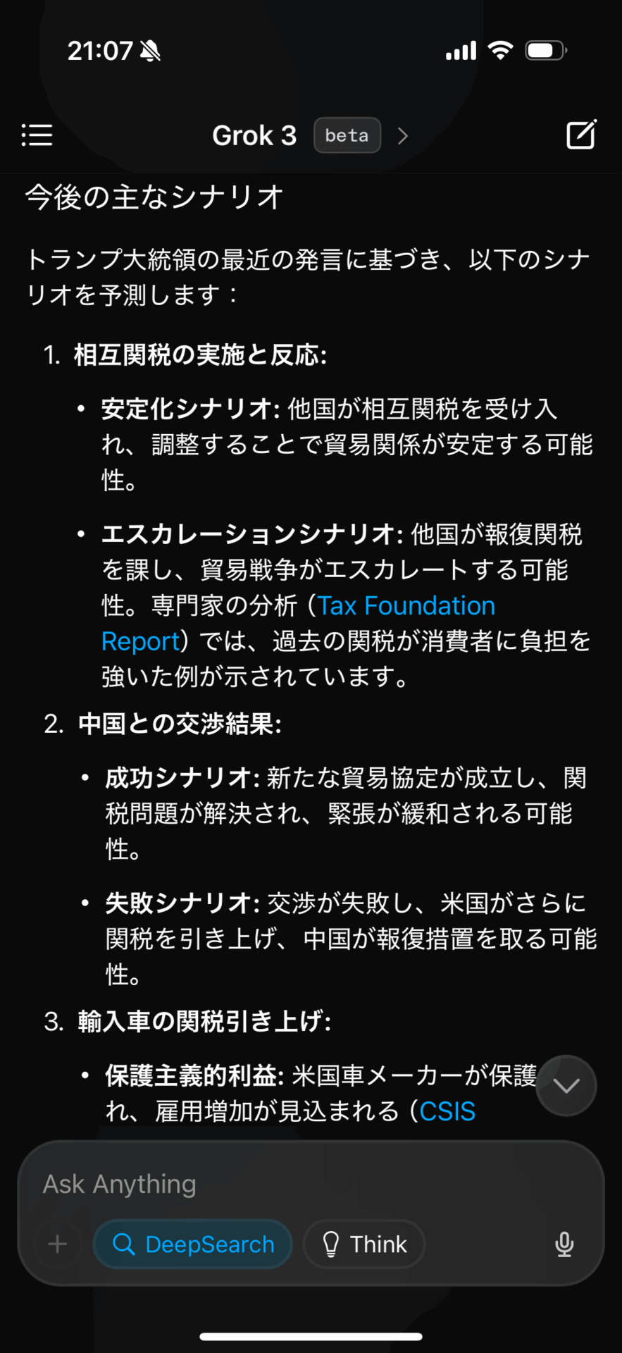 トランプ大統領のここ1週間の関税に関する発言をまとめて、今後ありうる主なシナリオを挙げてください。すると、トランプ大統領のX上でのツイートのほか、多数のニュースメディアやホワイトハウスの公式情報を参照し、レポートを生成してくれた。