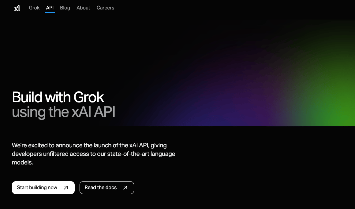 まずは、APIアカウントを作るため、xAIのAPIページにアクセスする。「Start building now」というボタンをクリックして、新規アカウントを作成するかXのアカウントでログインする。