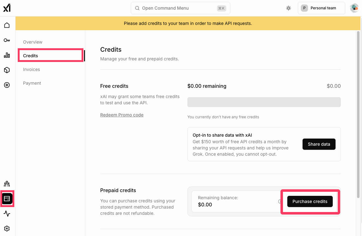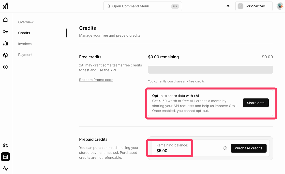 一度でもクレジットをチャージすると、xAIに対してAPIリクエストの内容を全て共有することに同意することで、毎月150ドルもの無料クレジットをもらえるプログラムにオプトインできるようになる。