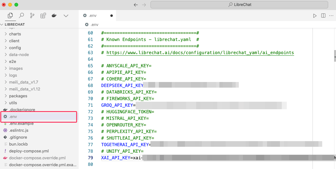 まず、LibreChatのインストールフォルダの中にある.envファイルの70行目付近に、各社のAPIキーを入力することのできる箇所があるので、「XAI_API_KEY」の部分に先ほど作成したAPIキーをコピペしておく。