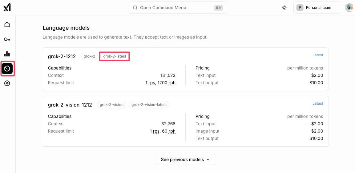 print(completion.choices[0].message.content)その時利用できるモデル名は、Grok APIの左側メニューでモデルを選択すると最新のエンドポイントの名前が確認できる。