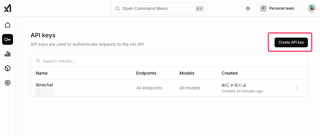 (今回は、このあとLibre ChatでこのAPIキーを使用するので、librechatという名前をつけておいた。)