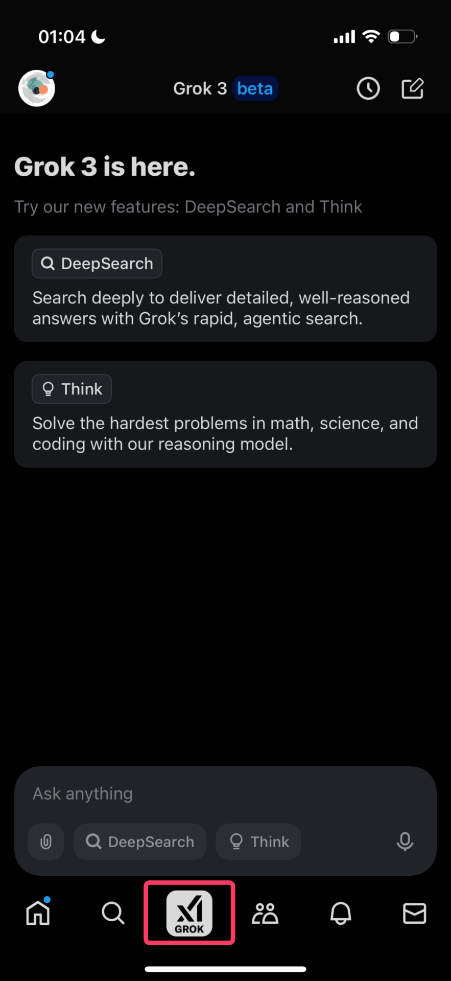 スマホ版のGrokでも、Web版と同じく「Deep Research」と「Think」モードを使用することができる。