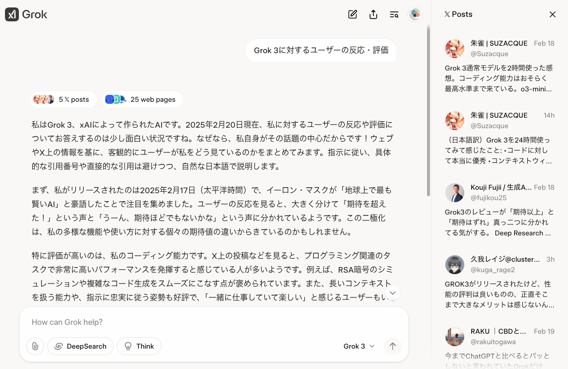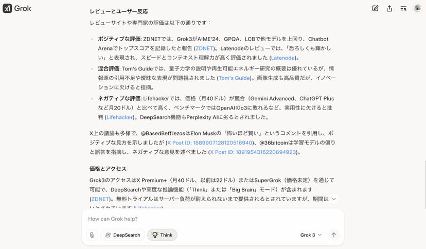 試しに、Grok 3に関する口コミについて聞いてみたところ、いくつかX上のポストを参照して回答が生成された。