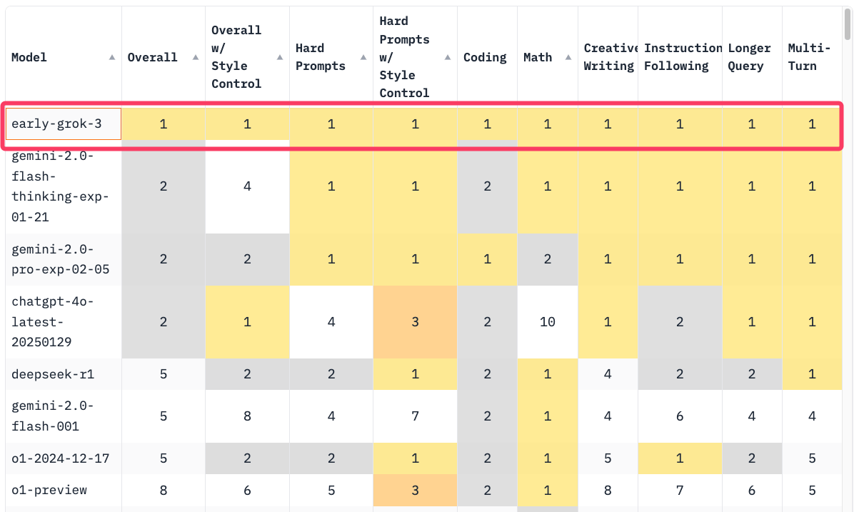 また、ユーザー投票によって生成される回答の質をランク付けする有名ベンチマーク「Chatbot Arena」のランキングでも、Grok 3が全分野で世界1位のモデルとなっている。