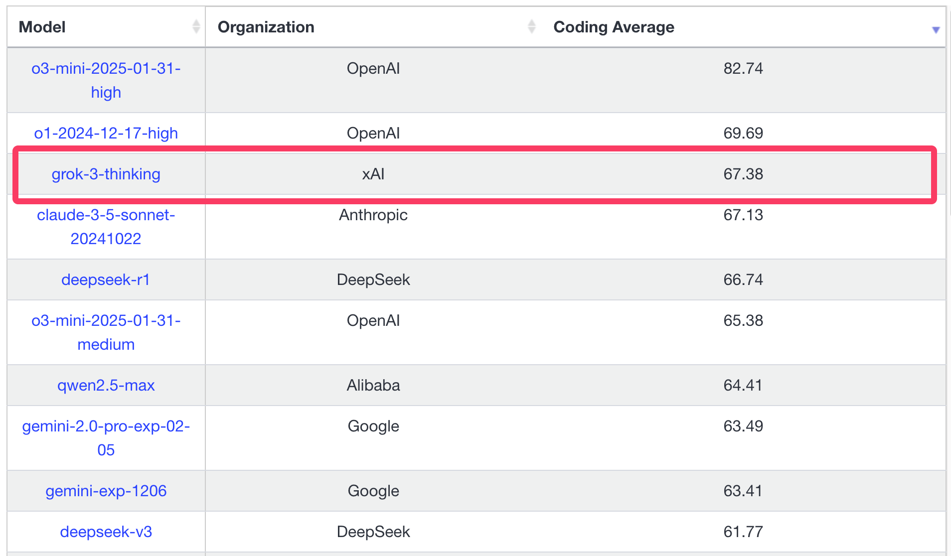 登場したばかりのGrok 3だが、各種ベンチマークで上位を席巻しており、英語圏のXやRedditなどではコーディングなどの実用面でも評判が良い。