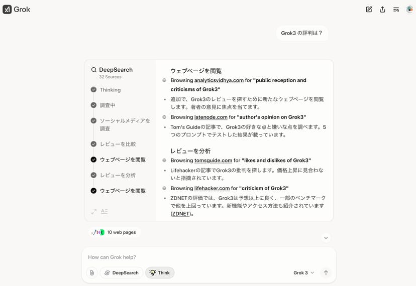 例えば、「Grok3の評判は?」とDeep Searchをオンにして聞いてみると、Web検索、Xポスト検索、主要なレビューの比較分析を何度か行き来しながら、32個ものソースを参照し、思考していく様子がリアルタイムで表示される。
